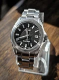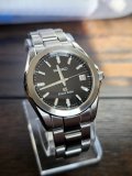 Up for sale is my pre-owned Grand Seiko SBGF021 (Caliber 8J56-8020) quartz watch, It's in good condition with minor usage marks consistent with regular wear. This "classic" timepiece features a precise and reliable 8J56 high-accuracy quartz (HAQ) movement (rated at ±10 seconds per year) housed in a durable 38mm stainless steel case. The black dial, sometimes described as having a subtle 'tatami' pattern, visible only in direct light, is a hallmark of Grand Seiko's craftsmanship and attention to detail, offering exceptional legibility with luminous hands and indices. The watch includes a date function and a screw-down crown that ensures 200m water resistance, making it both elegant and robust. Minor signs of use, such as light scratches or scuffs on the case, bezel, and bracelet are present and documented in the accompanying photos. Contact me for any further photos or questions.